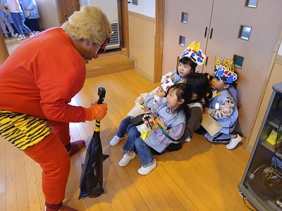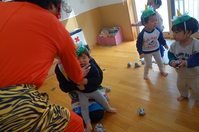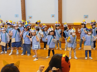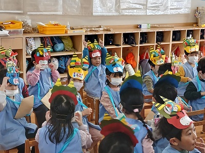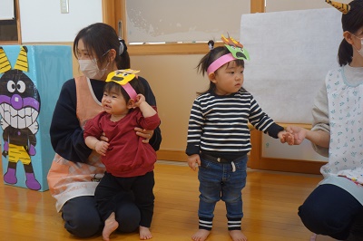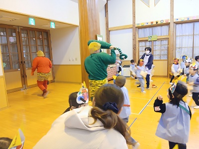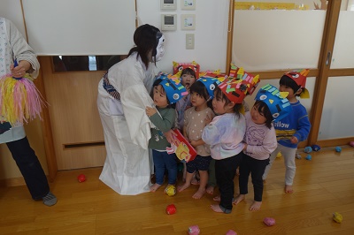 豆まき会 2月、豆まき会。 みんな~! オニになってホールにあつまって☆ どんなお面を作ったか見せあいっこをしたり、 「オニのパンツ」で遊んでいると・・・ オニ登場! みんなで豆やボールをぶつけて追いはらおう! 保育園部には福の神が助けにきてくれたね♪ 起こりん坊オニさん、泣き虫オニさん! バイバーイ!!