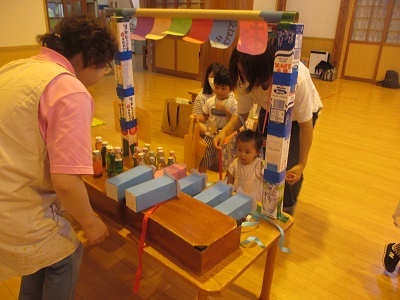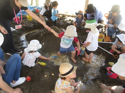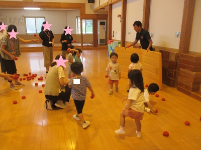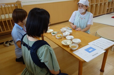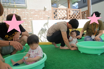 にこにこまん ~夏~ ◎たまごぐみ 〇水あそび おとうさんにも来ていただき、みんなでジャバジャバ! 〇離乳食試食会 園で提供される離乳食を食べながら、栄養士とお話し! ◎ひよこぐみ 〇泥あそび お家や公園でできないので楽しかったです!とのお言葉をいただきました♪ 〇運動あそび 体育の先生と体を動かしました! ◎たまごぐみ・ひよこぐみ合同 〇お買い物ごっこ 1番人気だった、おさんぽワンちゃん♡
