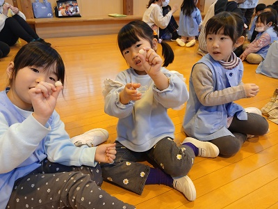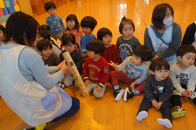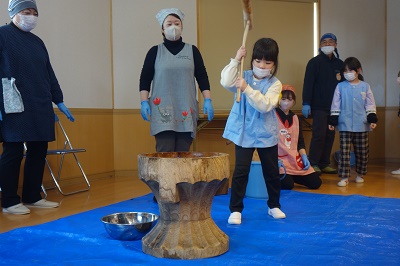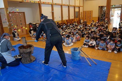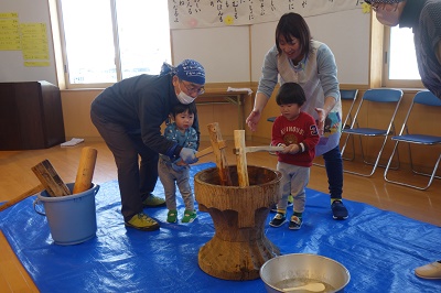 もちつき会 長かった冬休みが終わり、短い3学期が始まりました。 1月といえばもちつき会! 最初にもち米で”手”作りもち♪つぶして、こねて・・・やわらかくて気持ちいいね♡ 今年も近所のおじいちゃんおばあちゃんが来て、 もちつきのお手伝いをしてくれきました! もちつきに、いざ初挑戦☆ 小さいクラスの子たち 「1人でできるよ!!」 おつゆを飲みながら、よく噛んで食べて、 どんどん大きくなろう!