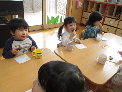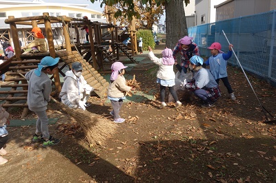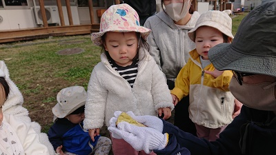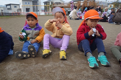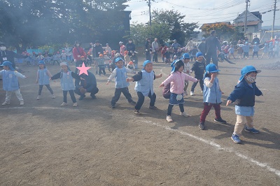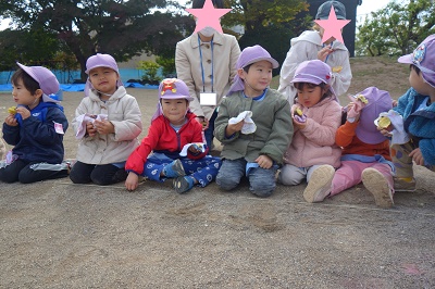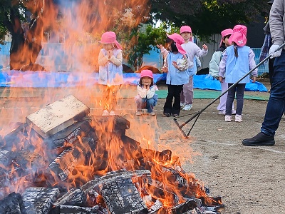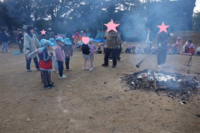 やきいも会 秋の楽しみの1つ、やきいも♪ みんなで落ち葉集めや、 火起こしのお手伝い! 火にやきいもを投げ入れて落ち葉の布団をかけたら・・・ けむりがモックモク!? できあがりまで、歌って踊ろう♪ できあがったオイモに小さいお友だちも興味津々! いっただきまーす♪ 保護者のみなさんにもたくさん手伝っていただき、ありがとうございました!! 保育園部の子たちは小さくしてから、いただきます♡